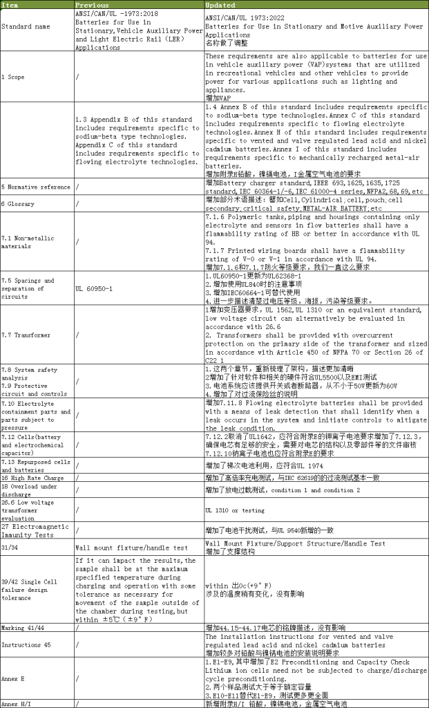 2022年2月25日,新版的UL1973正式发布,内容有了较大更新。标准解读和新旧版对比,具体如下: